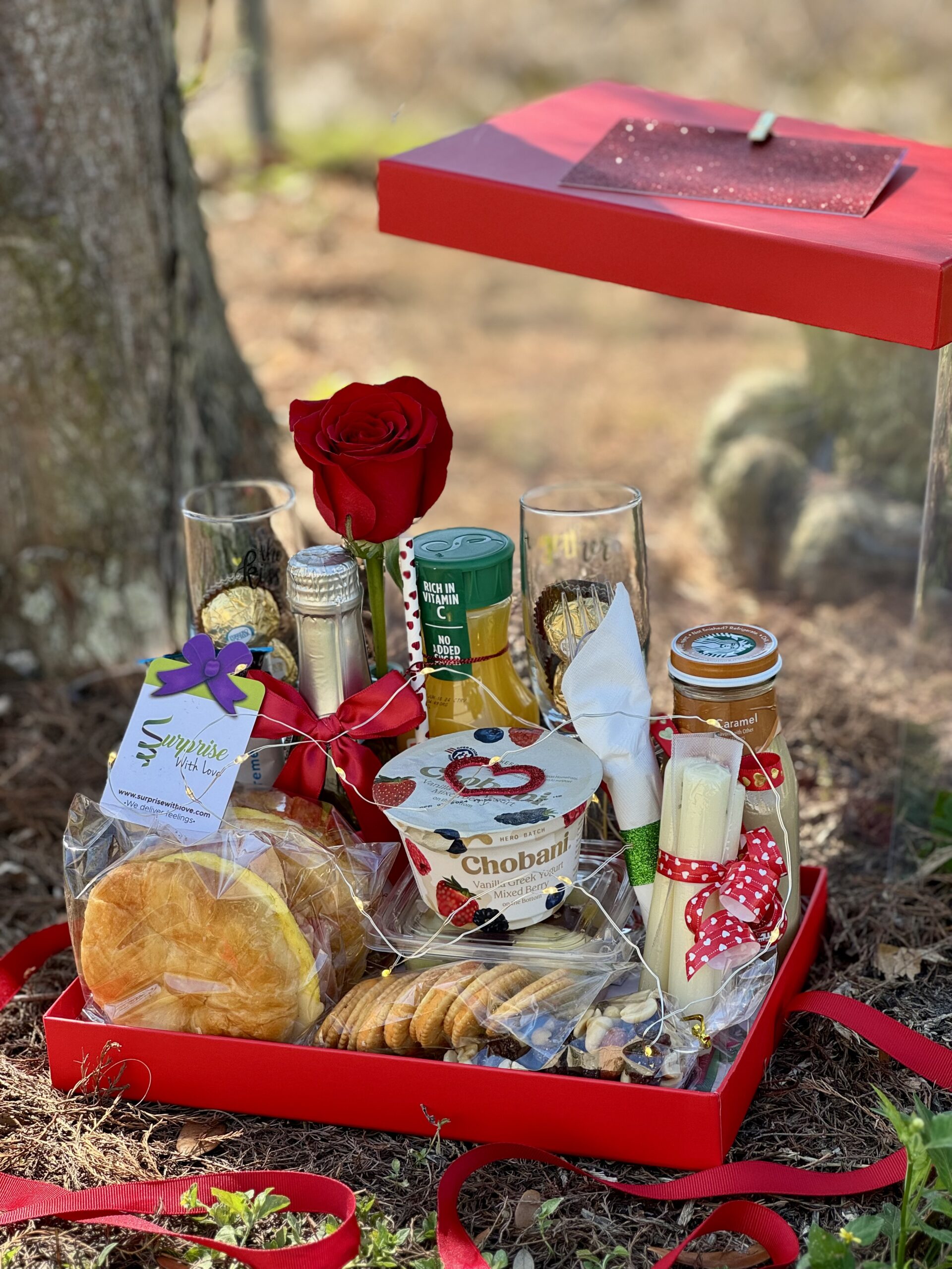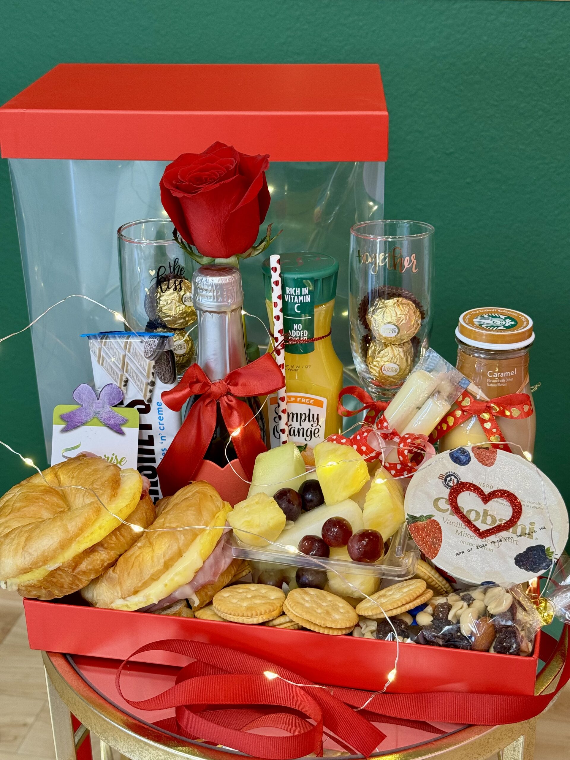 Esta completa opcion es ideal para compartir en pareja, su empaque en cristal deja al descubierto el contenido y logra darle un toque muy magico! Contiene café con leche, jugo de naranja, 2 sandwichs de huevo, jamon y queso, 2 copas para brindar con mimosa, galletas rellenas de queso, frutos secos, barra de chocolate, Ferreros Rocher, canasta de frutas frescas picadas, yogurt, barritas de queso mozarella y una rosa. Este hermoso regalo incluye una tarjeta con el mensaje que te guste y una guirnalda con luces blancas cálidas que aportan una sensación de frescura a la decoración de este desayuno.